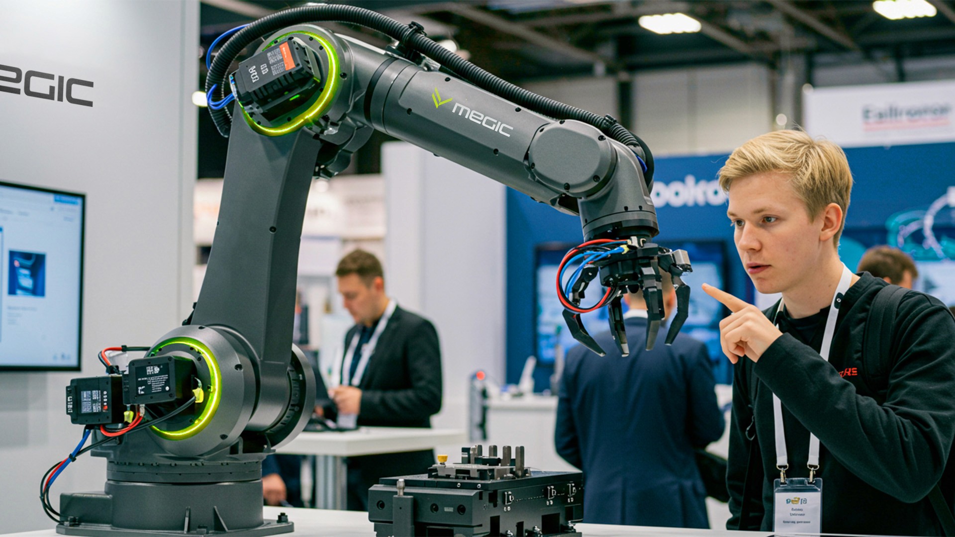 The rebrand's first major test was Automatica 2024. MEGIC's booth featured floor-to-ceiling lime and black graphics with the new logo prominently displayed. Product demonstrations used the new naming system.