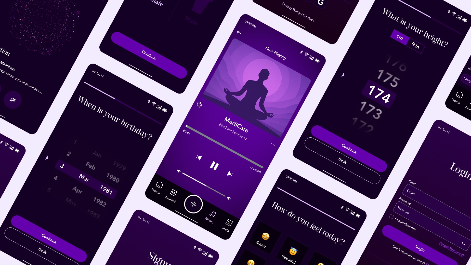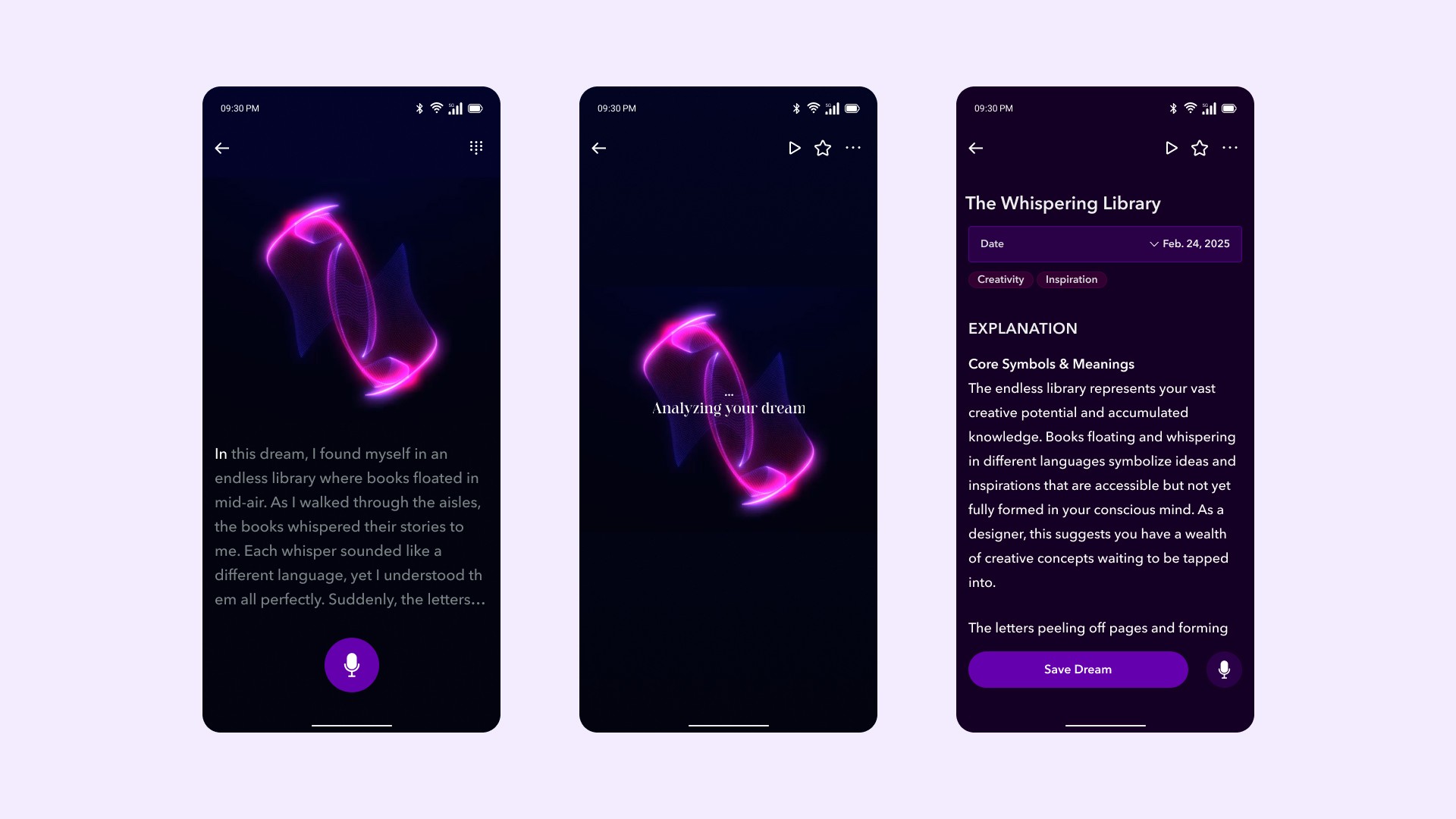 The purple gradient evokes the subconscious state without feeling depressing or heavy. Every color choice prioritized readability over aesthetic preference.